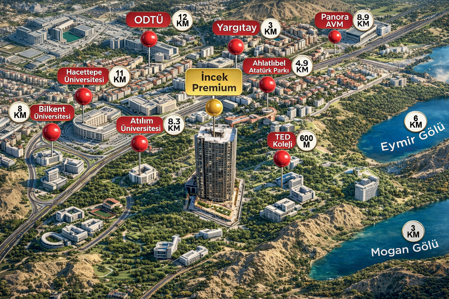 İncek Premium, Ankara’nın gelişen ve değer kazanan lokasyonlarından birinde konumlanarak şehir hayatı ile doğayı dengeli bir şekilde buluşturur. Proje; TED Koleji, Orta Doğu Teknik Üniversitesi, Hacettepe Üniversitesi, Bilkent Üniversitesi ve Atılım Üniversitesi gibi prestijli eğitim kurumlarına yakınlığıyla öne çıkarken, Yargıtay ve Panora AVM’ye kolay ulaşım avantajı sunar.